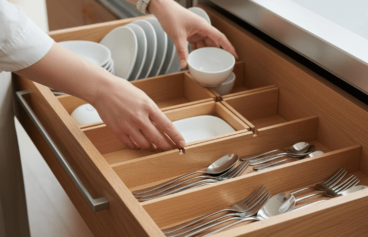 標準の仕切りに加えて、より細かくスペースを区切ることができる可動式の仕切り板や、カトラリーを種類ごとに美しく整理できる専用トレーなどがあります。