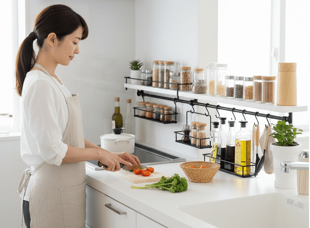 - ツールハンガーやスパイスラックで調理動線を最短化