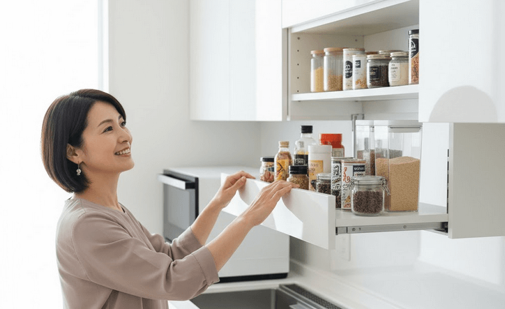 ボタン一つや軽い力で棚が目の前の高さまで降りてくるこのシステムは、背の低い方や、重いものを高い場所に上げるのが不安な方にとって、まさに救世主です。