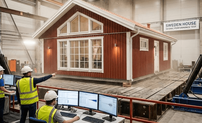 スウェーデンハウスでは、実際の建物を巨大な振動台に乗せて揺らす「実大振動実験」を行い、その耐震性能を検証しています。