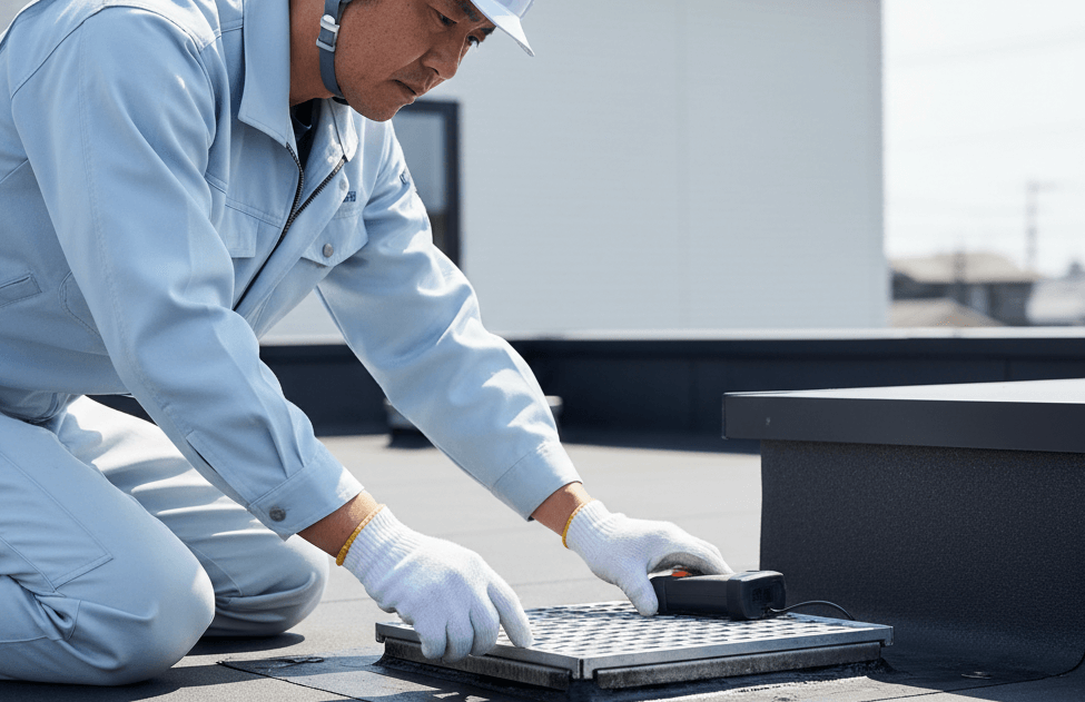 点検では、防水シートの浮きや膨れ、パラペット(手すり壁)のひび割れ、シーリングの劣化具合、排水ドレンの機能などが細かくチェックされます。