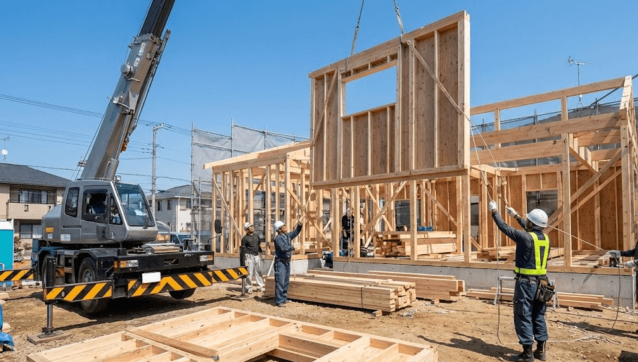 一条工務店の上棟は「空飛ぶ壁」と形容されるように、工場であらかじめ窓やタイルまで取り付けられた外壁パネルが大型クレーンで吊り上げられ、わずか数日で家の形が組み上がっていきます。