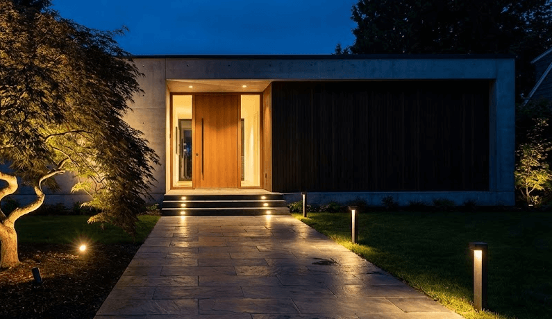 玄関ポーチ灯だけでなく、アプローチを照らすフットライトや、シンボルツリーを照らすスポットライト、外壁を照らすアッパーライトなどを配置することで、夜になるとまるでホテルのような高級感のある雰囲気を演出できます。