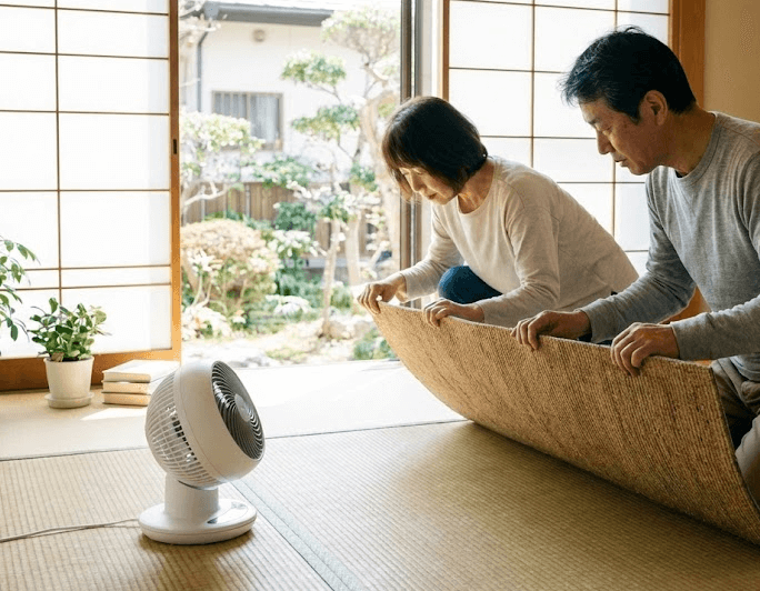 方法はシンプルで、フローリングカーペットをめくり、下の畳に風を当てることです。