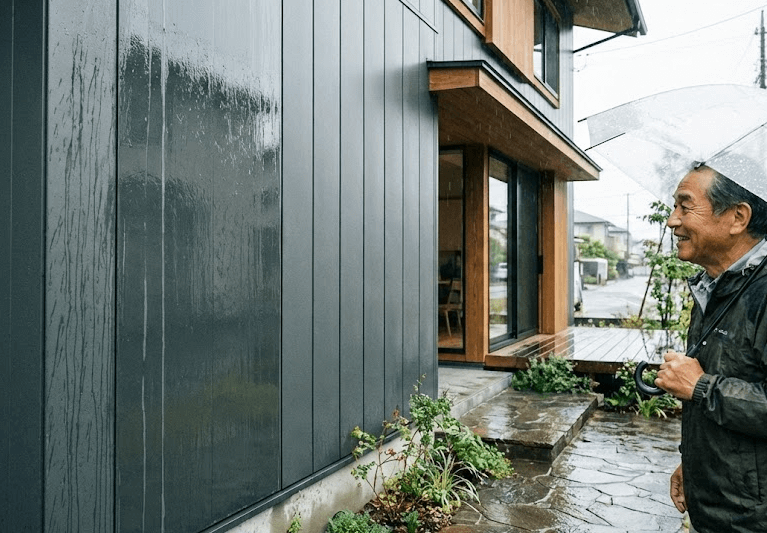 雨上がり直後に外壁を見て、水が膜状に広がっているか、あるいは水を弾いてしまっているかを確認することで、コーティングの状態をある程度把握することができます。