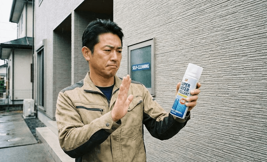 外壁が汚れないようにと、市販の防水スプレーや撥水剤を吹きかけようと考える方がいらっしゃいますが、これは親水コートの外壁においては絶対に行ってはいけないNG行為です。