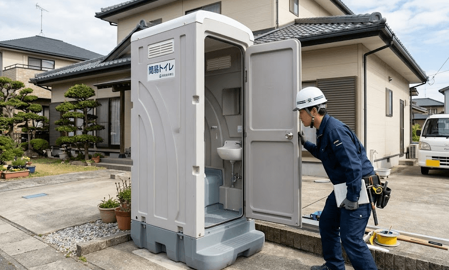 仮設トイレのレンタルやポータブルトイレの購入、あるいは近隣施設を利用するなど、ご家庭の状況に合わせた対策を考えておく必要があります。