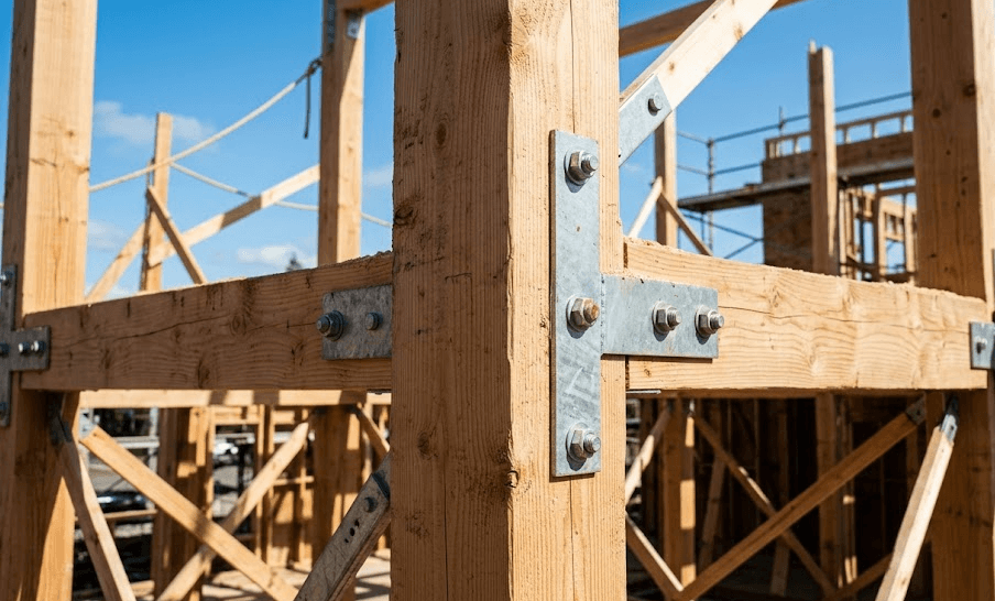 この重大な弱点を克服するために開発されたのが、専用の金属パーツを使用して木材同士を強固に緊結する金物工法です。